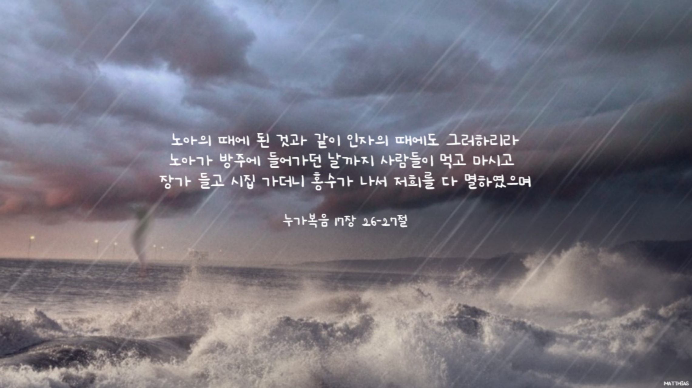 예수님 다시 오시는 주재림 때는 노아때와 같다고 했어요. 노아도 하나님의 지시대로 구원의 방주를 짓고, 100년을 외쳤지만, 사람들은 믿지 않았어요. 결과는 어떠했나요? 구원의 방주에 탄 자들만이 살았지요.